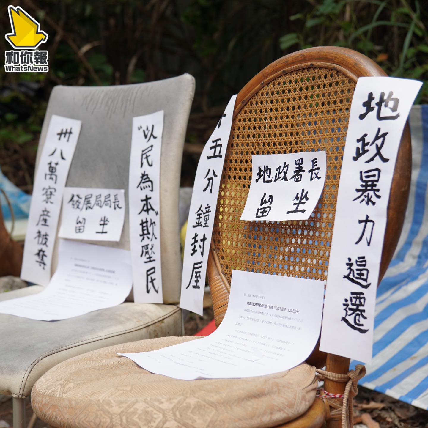 今天,是最後一批的村民需要搬離的最後死線,居民以消失的新界馬屎埔村為題開記者招待會,控訴地政署還沒安置好所有村民居所便匆匆要求他們離開。場地亦留有兩張空凳予地政署署長及發展局局長,分別寫上「卅八萬寮產被奪,以民為本欺壓民」及「十五分鐘封屋,地政暴力逼遷」,惟坐椅上並未見有任何官員。